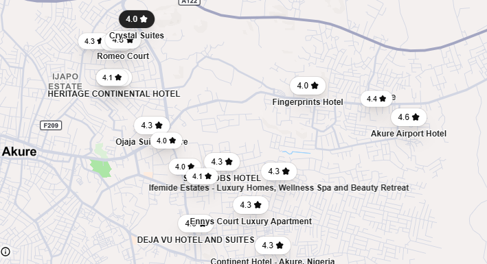 Areas such as Alagbaka, Ijapo and Oba Ile tend to offer a rich variety of hotels and convenient access to local markets, restaurants and attractions.